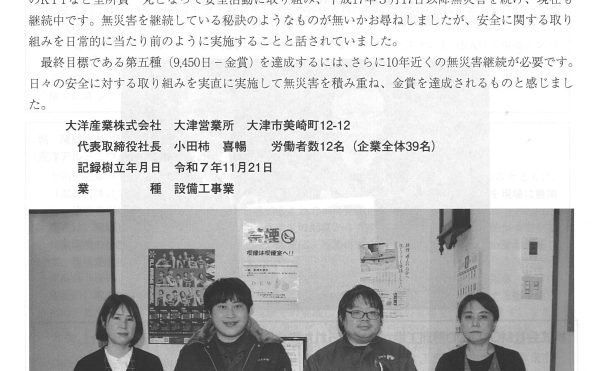 NEW 2026年3月16日お知らせ藤田実 「中小企業無災害記録第四種(銀賞)」受賞について掲載頂きました滋賀労働基準協会 滋賀労基 3月号で「中小企業無災害記録第四種(銀賞)」受賞について掲載頂きました。 中小企業無災害記録第四種(6,300日-銀賞)の達成に対する中央労働災害防止協会からの表彰状、表彰楯の授与と、安全に関 […]